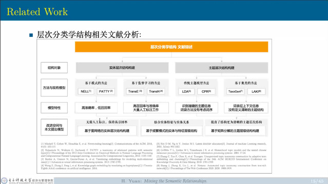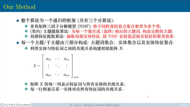 袁老师指出,通过将实体的共现关系表征成图网络,可以从图网络中学习顶层的概念、语义和层次关系,这种方法具有模型不必以学习到非常高质量的上下义关系为前提条件的优点。最后,袁老师提出可根据非负矩阵三因子分解模型、(类内)主题提取算法、局部特征提取算法这样一个递归的框架构建生成树。