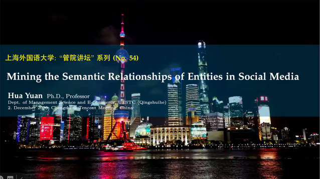 12月2日下午,上海外国语大学国际工商管理学院“管院讲坛系列学术讲座”第54期通过线上方式在腾讯会议顺利举办。此次邀请到了电子科技大学经济与管理学院袁华教授做主题为《社会化媒体中的语义关系挖掘》的前沿讲座。我院信息管理与决策科学系副主任张明月副教授主持讲座,来自我校各院系青年学者与学生90余人通过线上参加了此次讲座。