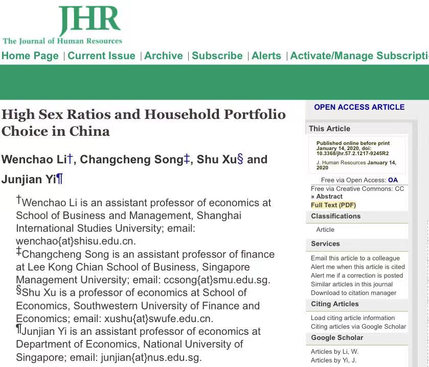 Wenchao Li, Changcheng Song, Shu Xu, and Junjian Yi*. High Sex Ratios and Household Portfolio Choice in China. Journal of Human Resources. Forthcoming. doi: 10.3368/jhr.57.2.1217-9245R2.