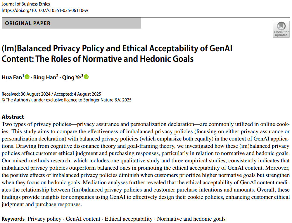 Fan, H., Han, B. & Ye, Q. (Im)Balanced Privacy Policy and Ethical Acceptability of GenAI Content: The Roles of Normative and Hedonic Goals. J Bus Ethics (2025). https://doi.org/10.1007/s10551-025-06110-w