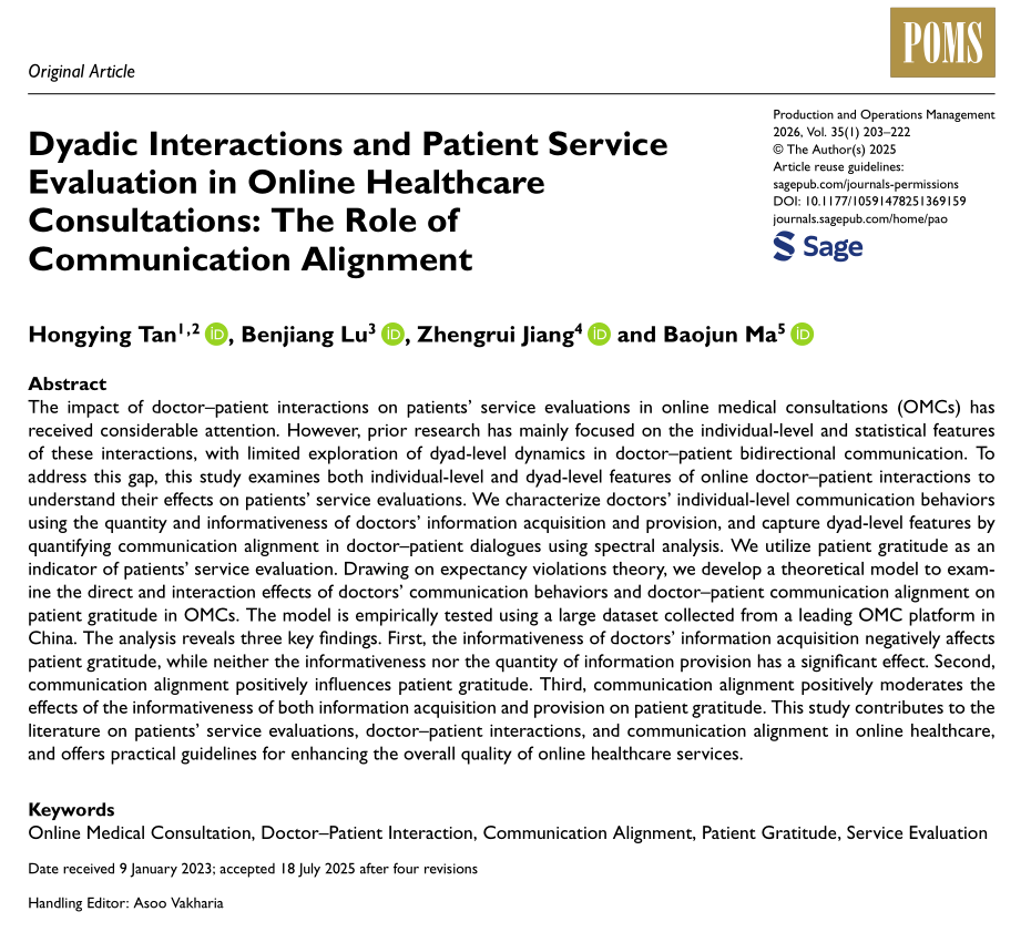 Hongying Tan, Benjiang Lu*, Zhengrui Jiang, Baojun Ma*. Dyadic Interactions and Patient Service Evaluation in Online Healthcare Consultations: The Role of Communication Alignment. Production and Operations Management, 2026, 35(1): 203-222. https://doi.org/10.1177/10591478251369159