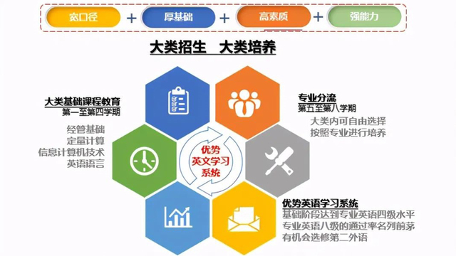 此外,上外大数据管理与应用专业依托国际工商管理学院“卓越管理人才计划”与其他平行专业信息管理与信息系统(数据科学与商务分析方向)一起实行大类招生。为学生提供“一次高考、两次选择”的机会,避免高考志愿填报时因未能深入了解而选择与自身兴趣和潜能不匹配专业的情况。学生入学时录取为工商管理类、管理科学与工程类两个大类,实施“卓越管理人才计划”,不分专业,在第1~4学期内学习相同的大类平台课程。第4学期结束时,实行专业分流,学生根据自身学科兴趣和能力,可自愿选择大数据管理与应用专业修读。