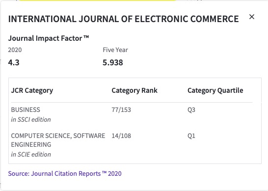 International Journal of Electronic Commerce是同时被SSCI和SCI检索的电子商务领域的顶级期刊之一,2020年影响因子为4.3,曾被Business 2.0杂志评为最重要的电子商务学术期刊并且在ACM通信出版的电子商务研究期刊中排名第一。该期刊致力于推进对电子商务领域的理解和实践,为电子商务领域的研究人员和从业者提供融合学科方法的新观点。