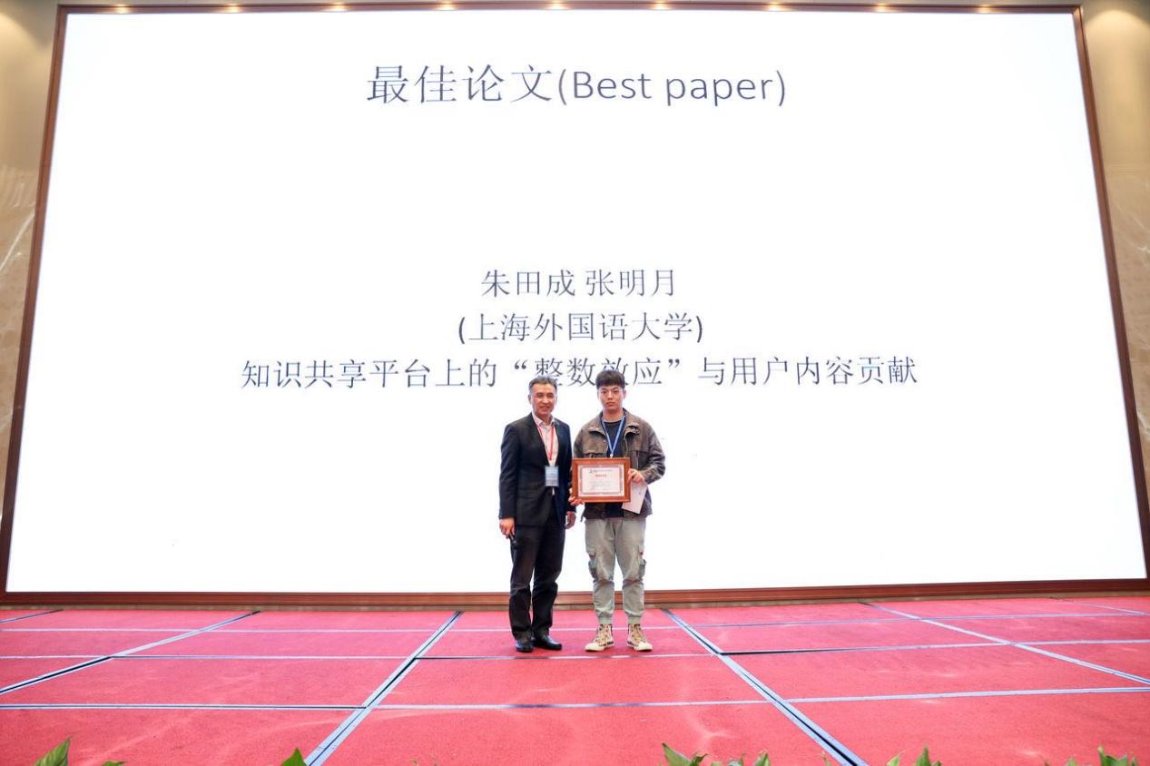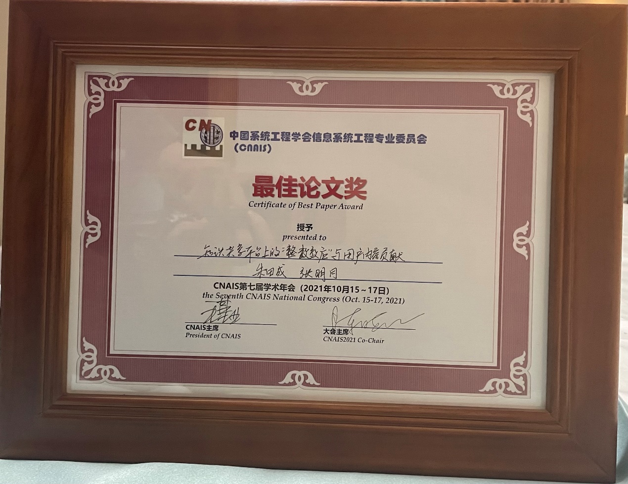 2021年10月17日,国际工商管理学院硕士研究生朱田成,在其导师张明月副教授(信息管理与数字营销方向博导)的指导下撰写的论文《知识共享平台上的“整数效应”与用户内容贡献》,获评中国系统工程学会信息系统工程专业委员会2021年年会(CNAIS 2021)唯一的最佳论文奖。此次大会注册参会人数超800人,共接收76篇口头汇报论文和63篇海报张贴论文,此获奖论文为此次大会评选出的唯一最佳论文(另有两篇最佳论文提名)。