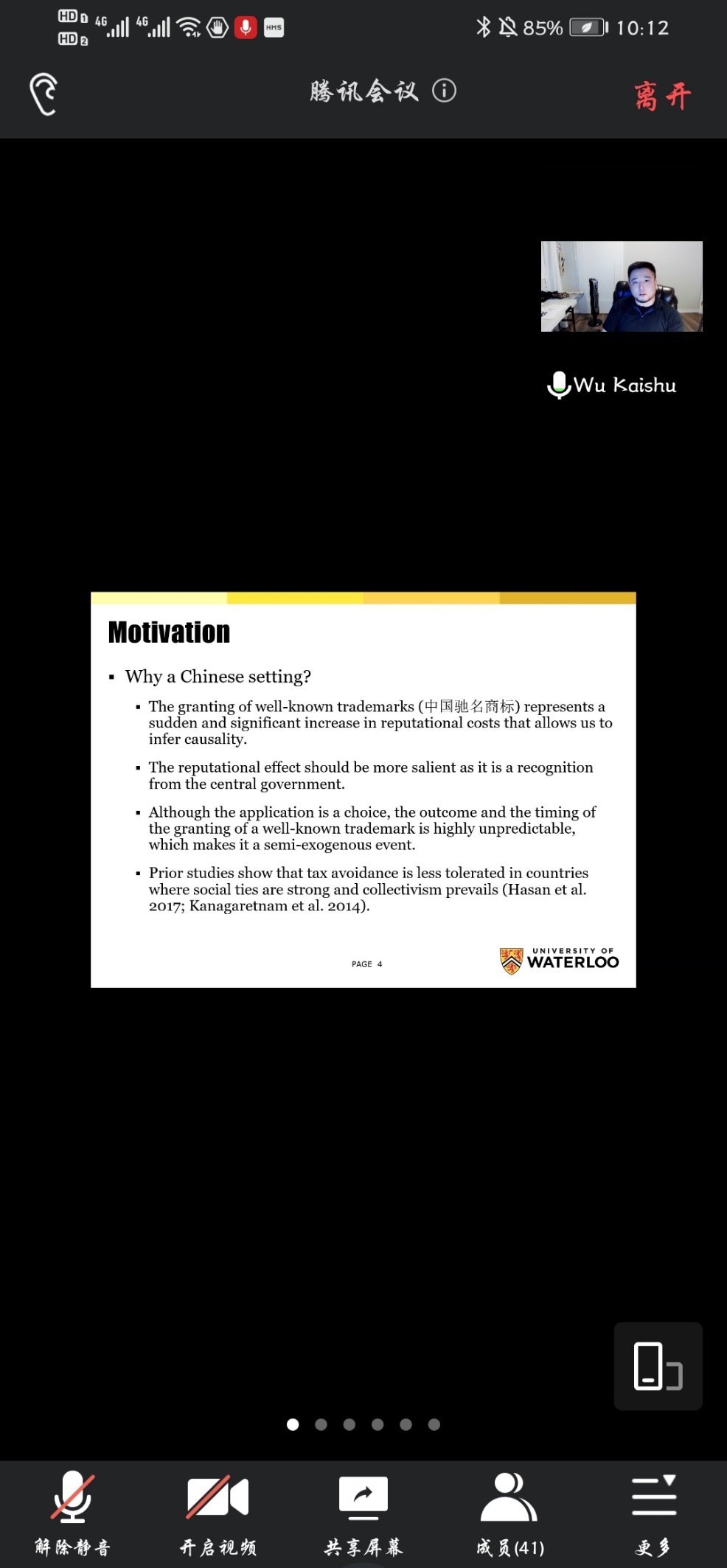 5月28日,上海外国语大学国际工商管理学院“管院讲坛系列学术讲座”第65期通过腾讯会议在线上顺利举办。应我院邀请,加拿大滑铁卢大学会计与金融学院助理教授吴楷纾做了题为“The Reputational Costs in Corporate Tax Avoidance: Evidence from Well-Known Trademarks in China”的精彩讲座。我院助理教授肖懿主持本次讲座,学院部分教师、研究生及本科生参加了此次讲座。