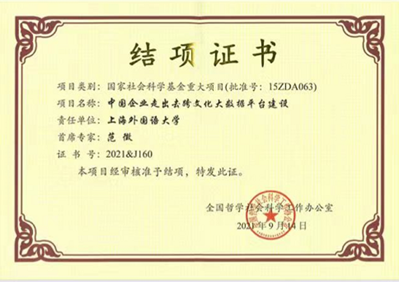 我校国际工商管理学院范徵教授作为首席专家领衔主持的国家社会科学基金重大项目“中国企业走出去跨文化大数据平台建设”(15ZDA063)圆满完成研究任务,正式通过全国哲学社会科学工作办公室审核验收,顺利结项。该项目2015年7月29日立项,2021年9月14日结项。为我校管理学科史上首次获得的国家级重大项目。