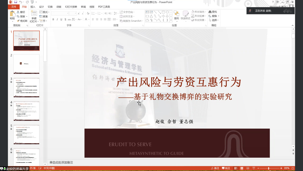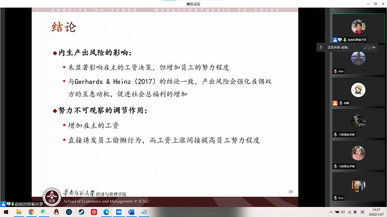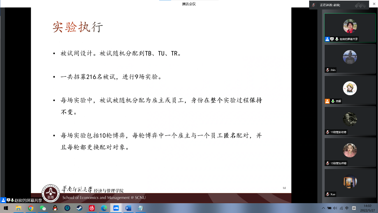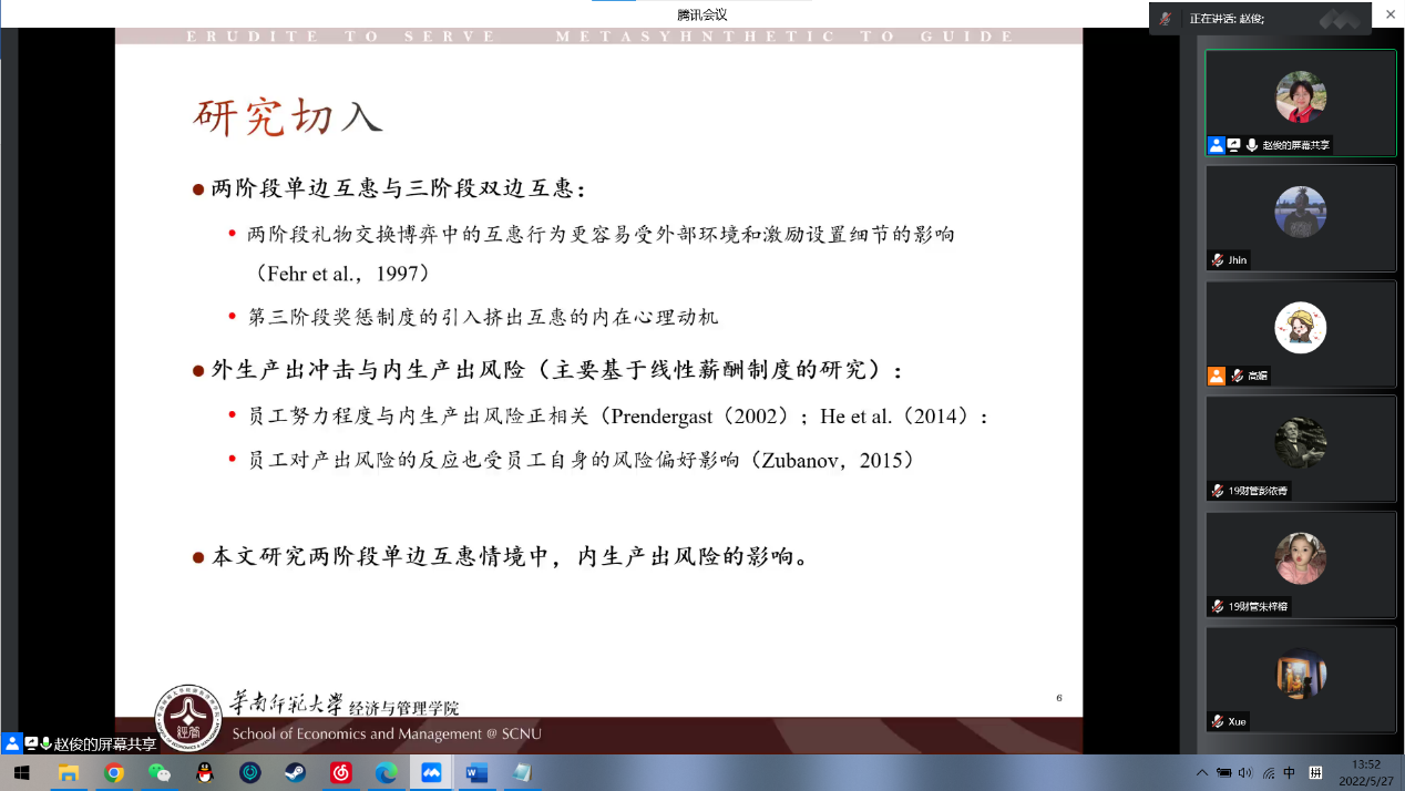 5月27日,上海外国语大学国际工商管理学院“管院讲坛系列学术讲座”第84期通过腾讯会议顺利在线上举办。应我院邀请,华南师范大学经济与管理学院教师赵俊为我院做了题为“产出风险与劳资互惠行为——基于礼物交换博弈的实验研究”的精彩讲座。高媚助理教授主持了本次会议,学院近三十多名教授、教师、博士生、研究生及本科生参加了此次讲座。