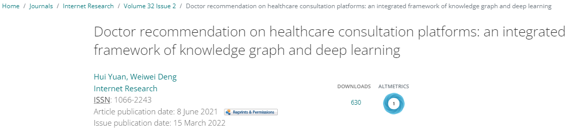 12. | Doctor recommendation on healthcare consultation platforms: an integrated framework of knowledge graph and deep learning | Internet Research | 计算机科学领域TOP,SSCI/SCI一区,影响因子7.089 |