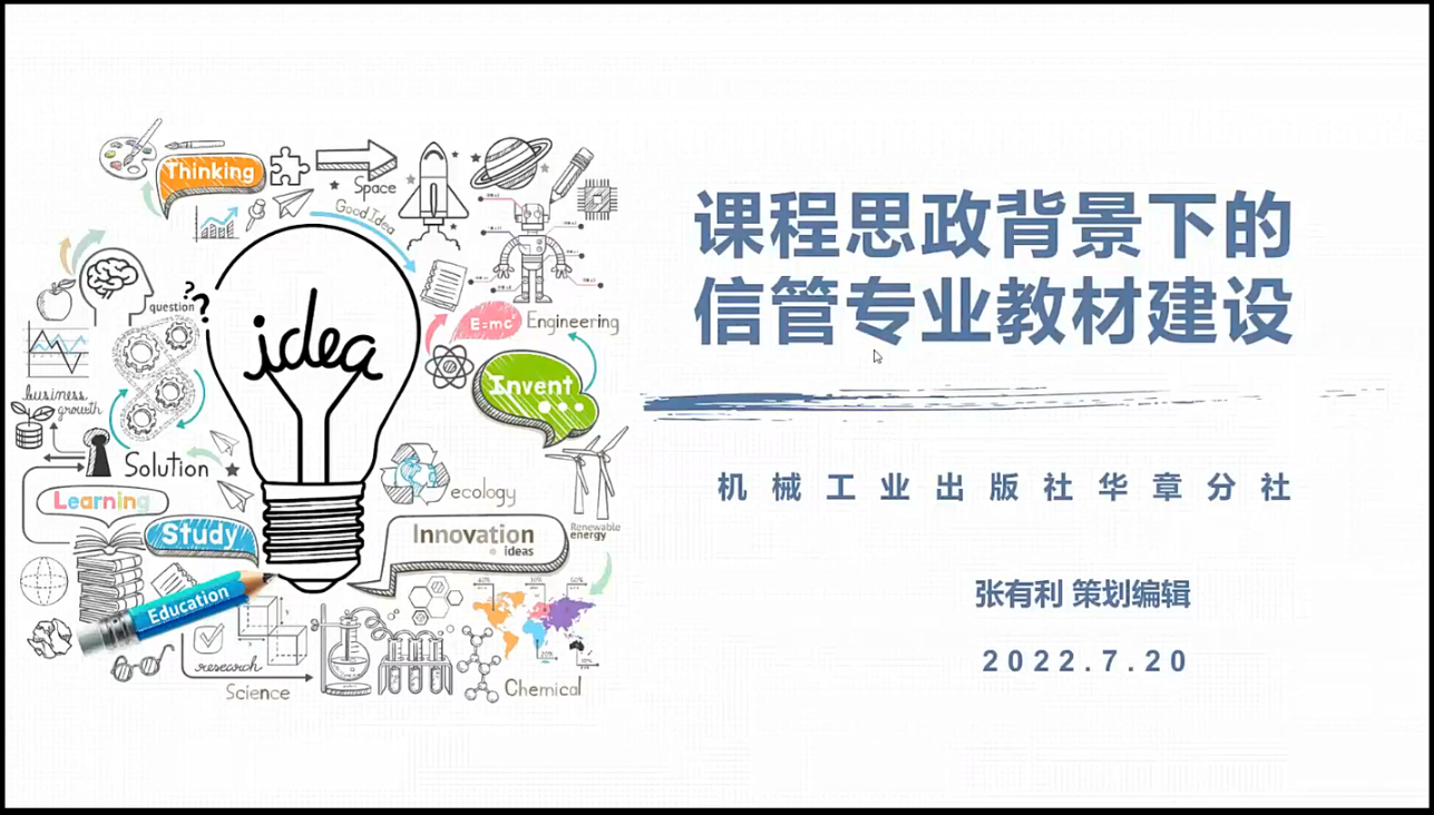 2022年7月20日下午,我院牵头的信息管理与信息系统专业虚拟教研室“教材建设系列”讲座通过腾讯会议在线上顺利举办。应虚拟教研室邀请,合作支持单位机械工业出版社华章分社张有利编辑为虚拟教研室成员单位信管专业老师们带来了题为“编辑谈出版:课程思政背景下的信管专业教材建设”的分享讲座,这也是为数不多的、站在出版社编辑角度来解读专业教材建设的讲座活动。讲座由虚拟教研室主任助理、我院信息管理与决策科学系副主任张明月副教授主持,虚拟教研室成员单位50余名教师参加了此次讲座。
