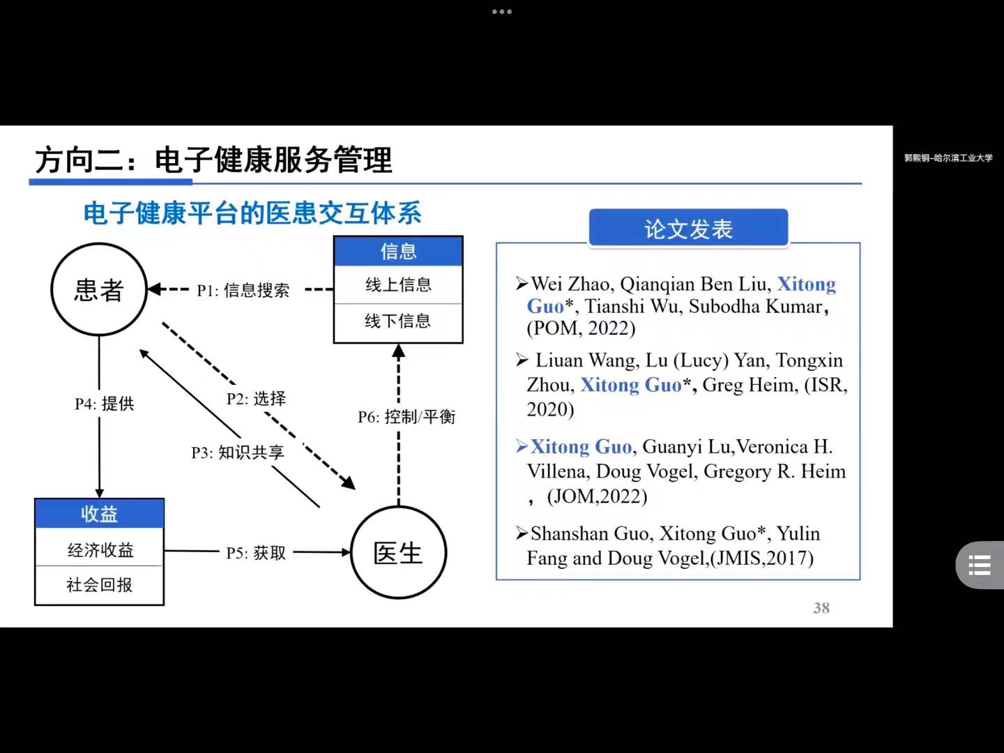 郭熙铜,哈尔滨工业大学长聘教授,博士生导师,国家杰出青年科学基金获得者。主要研究领域为数字医疗健康。学术论文发表在MISQ、ISR、POM、JOM、JMIS等国际学术刊物上,入选爱思唯尔中国高被引学者(2020,2021)。主持国家自然科学基金重点项目,研究成果应用于多地卫生机构,入选国家自然科学基金十三五资助项目优秀成果选编。