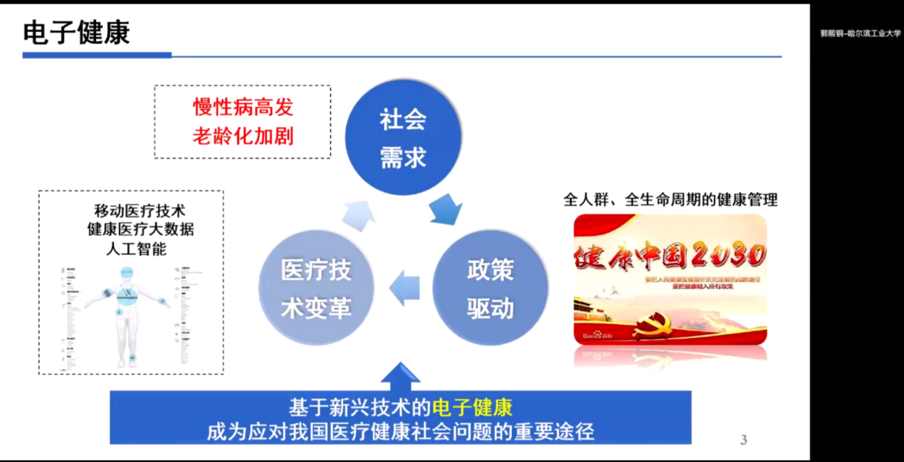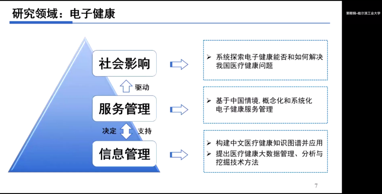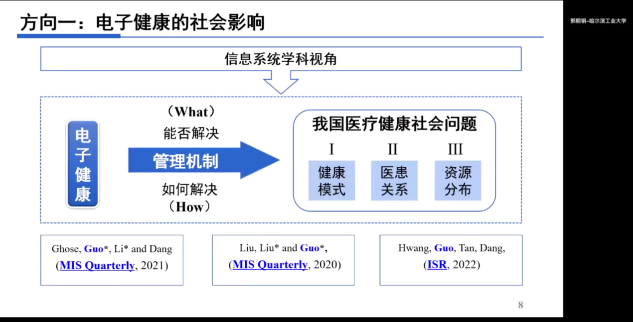 在本次讲座中,郭熙铜教授主要从背景内涵、科学研究、实践应用、人才培养、未来思考这五个方面介绍信息系统视角下的医疗健康管理研究与实践。郭教授指出,社会对医疗的高需求、医疗技术水平变革以及政策促使了基于新兴技术的电子健康成为应对我国医疗健康社会问题的重要途径。郭教授从信息管理、服务管理和社会管理三大方面分别介绍了团队从2010年到2022年对于电子健康的研究,并通过举例展现研究成果。