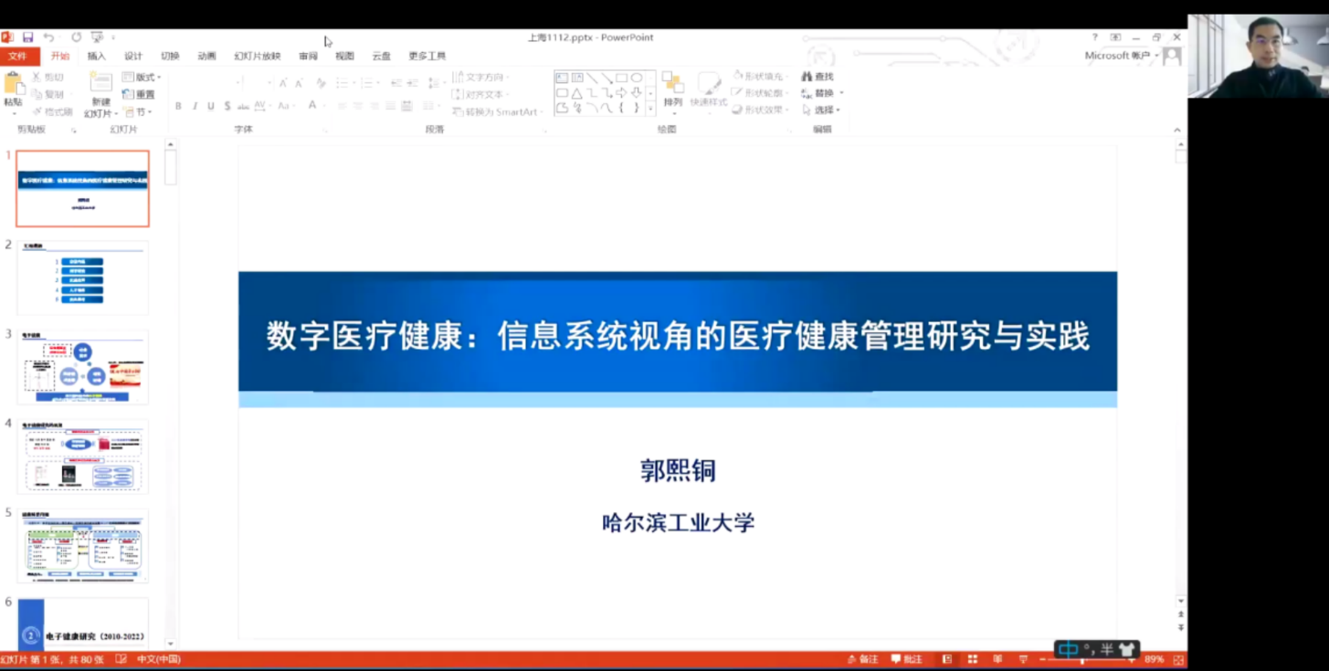 11月12日,上海外国语大学国际工商管理学院“研究生学术训练营”第4讲通过腾讯会议顺利在线上举办。应我院邀请,哈尔滨工业大学郭熙铜教授为我院师生分享了题为“数字医疗健康:信息系统视角的医疗健康管理研究与实践”的精彩讲座,马宝君教授主持了此次会议。来自上外管院及全国各个高校的老师、本科生、研究生、博士生参加了此次讲座,线上参会人数超过150人。