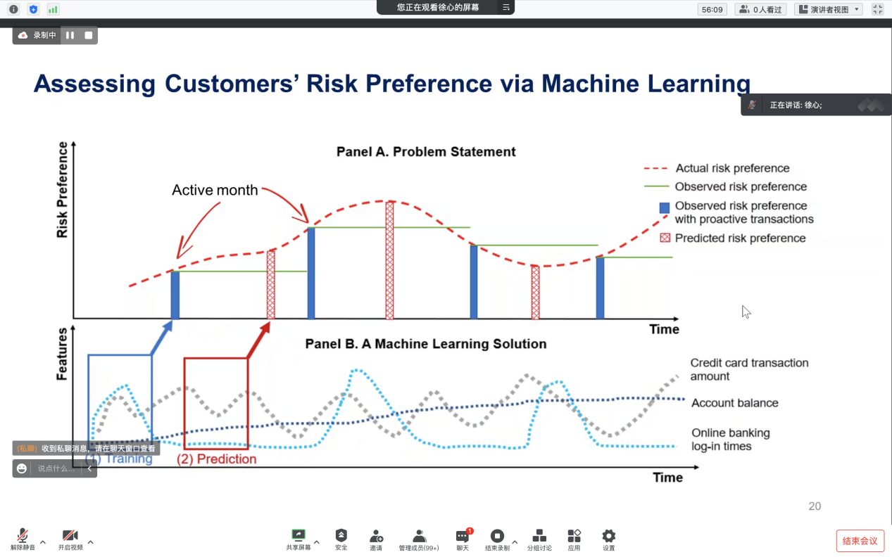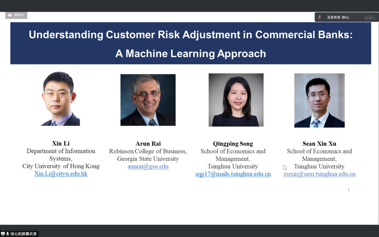 11月15日,上海外国语大学国际工商管理学院“研究生学术训练营”第5讲通过腾讯会议顺利在线上召开。应我院邀请,清华大学经济管理学院徐心教授为我院做了题为“Understanding Customer Risk Adjustment in Commercial Banks: A Machine Learning Approach”的精彩讲座,潘煜院长与马宝君副院长主持了此次会议,来自上外管院以及全国各个高校的师生参加了此次讲座。