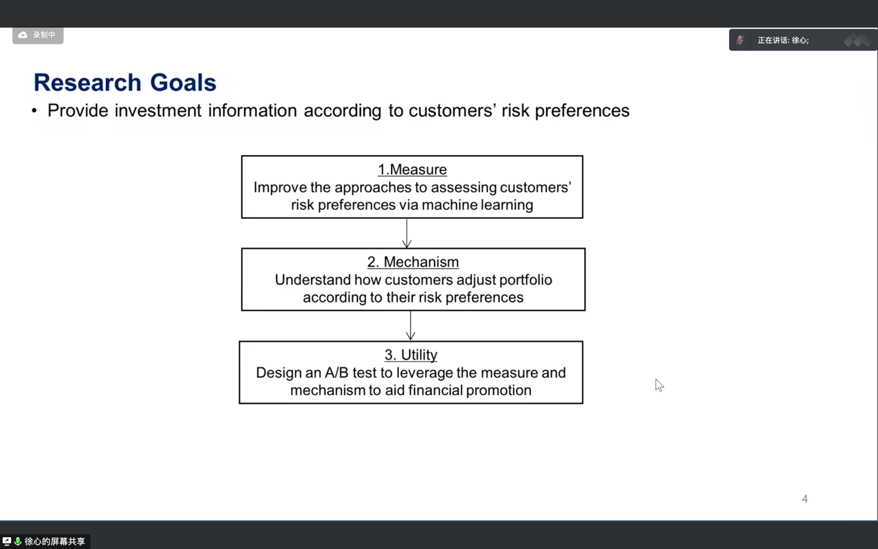 本研究中,徐心教授及其合作者关注商业银行中顾客的风险偏好问题,具体包括三个目标:首先,开发一个衡量顾客风险偏好的指标;其次,探索顾客是如何根据他们的风险偏好来调整自己的风险投资组合;最后,在理解顾客决策过程的基础上,有针对性地设计A/B测试,更好地给顾客推荐金融产品来辅助他进行决策。