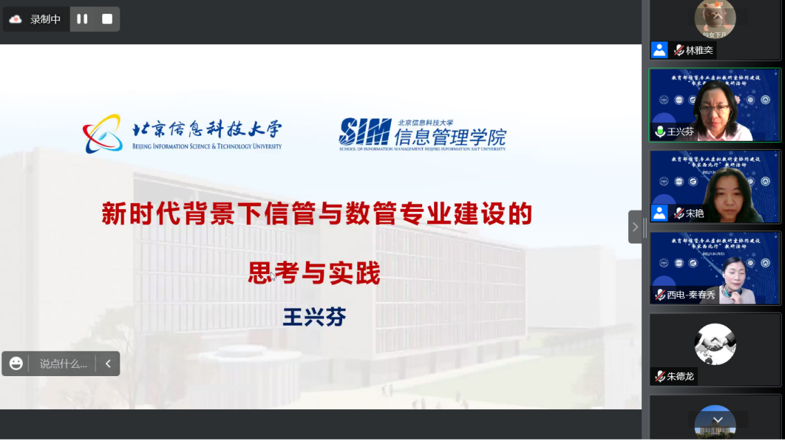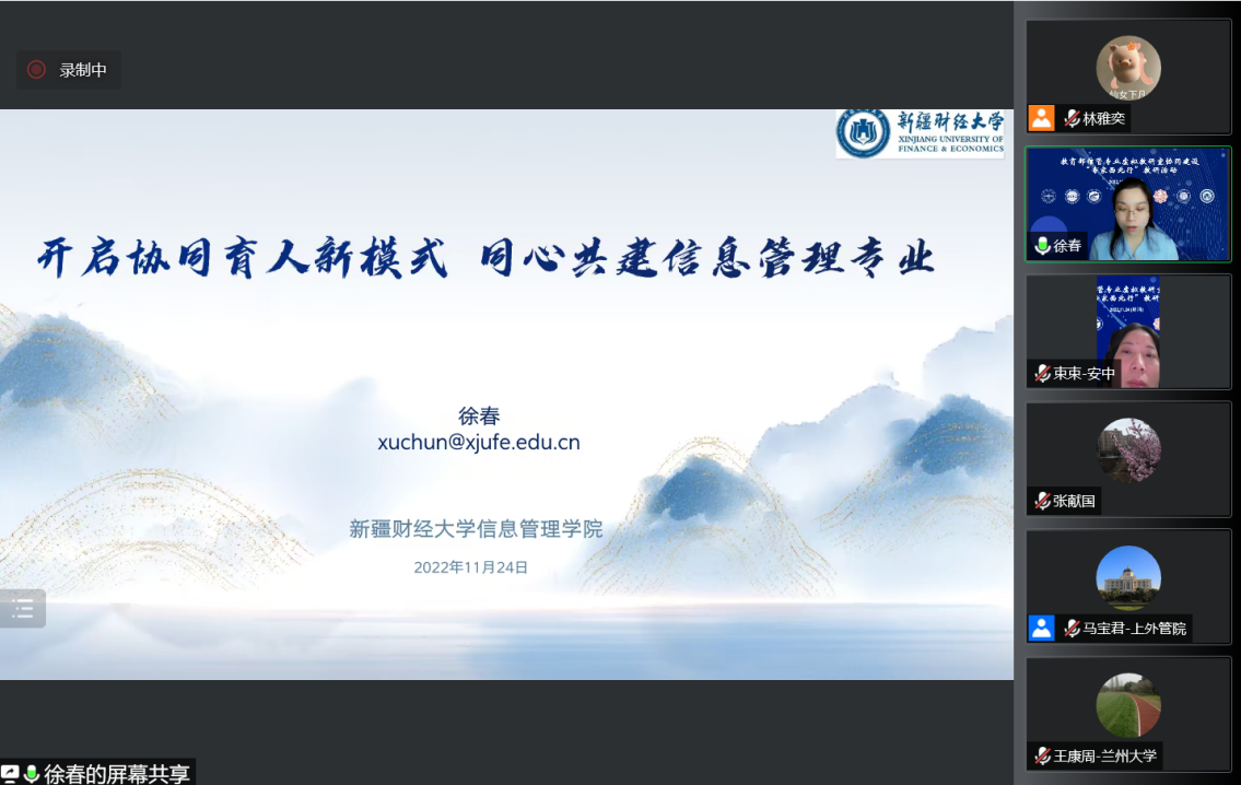 2022年11月24日,我院牵头的教育部信息管理与信息系统专业虚拟教研室顺利举办“协同建设专家西北行”教研活动。本次教研活动由虚拟教研室主任、我院副院长马宝君教授、副主任宋艳教授共同主持,活动特别邀请了教育部管理科学与工程类专业教指委委员、北京信息科技大学研究生院常务副院长兼学位办主任王兴芬教授,国家级青年人才、清华大学经济管理学院长聘教授、信管专业负责人郭迅华教授分享信息管理与信息系统专业建设的实践与思考。同时,虚拟教研室六个西北地区成员单位的专业负责人也进行了分享汇报,分别是兰州大学管理学院管理学系主任、国家级青年人才王康周教授,西安财经大学管理学院信管专业负责人陈树广教授,宁夏大学前沿交叉学院数字经济研究中心主任周学勤教授,西安电子科技大学信息管理系主任、信管专业负责人秦春秀教授,内蒙古大学计算机学院信息工程管理系主任、信管专业负责人张献国副教授,新疆财经大学信息管理学院信管专业负责人徐春教授。此次教研活动在腾讯会议上举行并由合作支持单位智慧树网全程同步直播,虚拟教研室成员单位及相关兄弟院校教师代表280余人在线参加了此次活动。