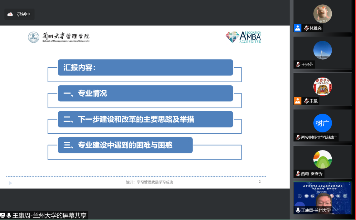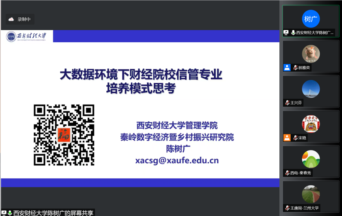 接下来,虚拟教研室的成员单位依次进行专业建设的分享汇报。首先由兰州大学王康周教授做了题为“兰州大学信管专业建设历程”的报告分享。王教授分别从兰州大学信管专业现状、下一步专业建设和改革的思路及举措以及困难与困惑三方面进行了分享,强调下一步的改革思路是以“新文科”思路统领信管专业建设,从加强师资队伍建设、多层次提升国家化水平和运用数字化技术持续改革教学模式等方面进行专业建设与改革。接着由西安财经大学陈树广教授带来主题为“大数据环境下财经院校信管专业培养模式思考”的分享。陈教授重点分享了以下几方面的信管专业发展探索模式:(1)明确培养目标,体现大数据思维;(2)契合大数据需求的课程体系改革;(3)课程建设采用模块化;(4)大数据思维的人才培养模式改革。同时,也提出了一些困惑和问题,例如课程归属模糊、专业特色不突出、教师队伍结构不合理、课程置换的认证规范问题、标志成果很难突破。上午场活动的最后是由宁夏大学周学勤教授带来的“数字经济时代信管专业的新视界”分享报告。周教授首先介绍了数字经济时代技术快速迭代、学科交叉融合、人才需求跃升的信管专业建设背景,指出“信管人才培养周期长与需求变化周期短的矛盾”、“理论的集成要求与技能的精深要求的矛盾”的两对矛盾将长期存在;接着从专业发展的探索初建、积累发展、转型升级三个阶段出发,建议将专业建设目标聚焦到“文理交叉”、“文工”融合、“产业+文理工”三方面,专业特色朝着商务大数据分析、运筹优化算法工程、信息系统开发三个方向发展,努力培养学生大数据分析能力、平台应用能力、自主学习能力和创新创业能力。
