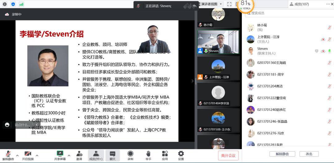 12月19日下午,上外管院职业发展与校友会办公室特别邀请上海CPCP教练俱乐部发起人、ICF认证专业教练PCC、心理韧性教练李福学老师,围绕“韧商与领导力”进行专题分享与探讨。