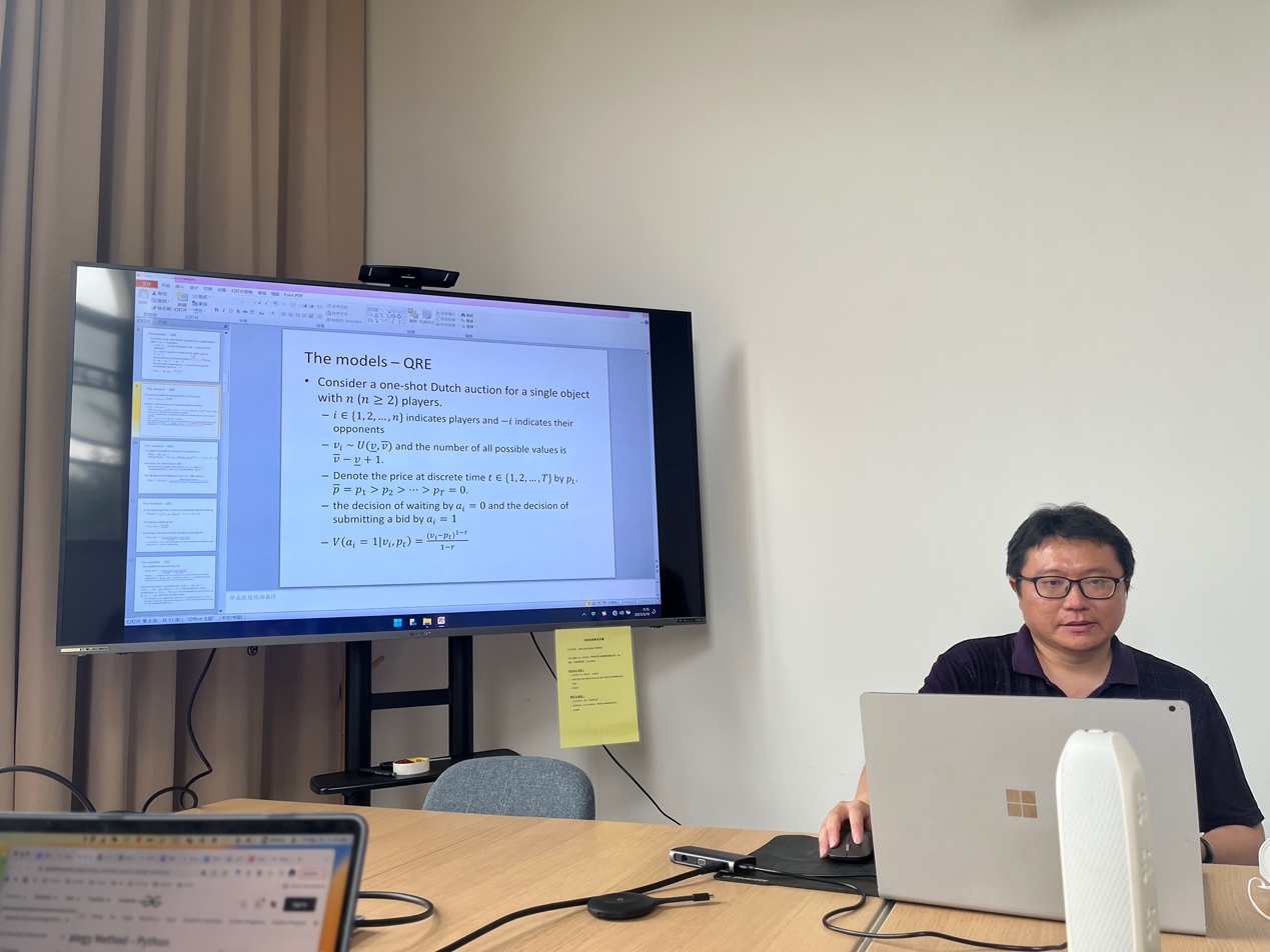 冯老师首先阐述了荷兰式拍卖的基本原理和研究背景,指出影响拍卖者出价行为的五个要素,分别是风险规避、有限理性推测他人出价、决策偏差、时间成本和信念更新偏误。通过文献回顾,发现现有的相关研究存在两个不足:一是没有考虑信念更新偏误对拍卖结果的影响;二是没有探讨贝叶斯信念更新和决策偏差之间的交互效应。因此,冯老师认为,要想准确地识别这五个相互交织的影响要素在荷兰式拍卖中的作用,必须借助数学化模型来进行分析。