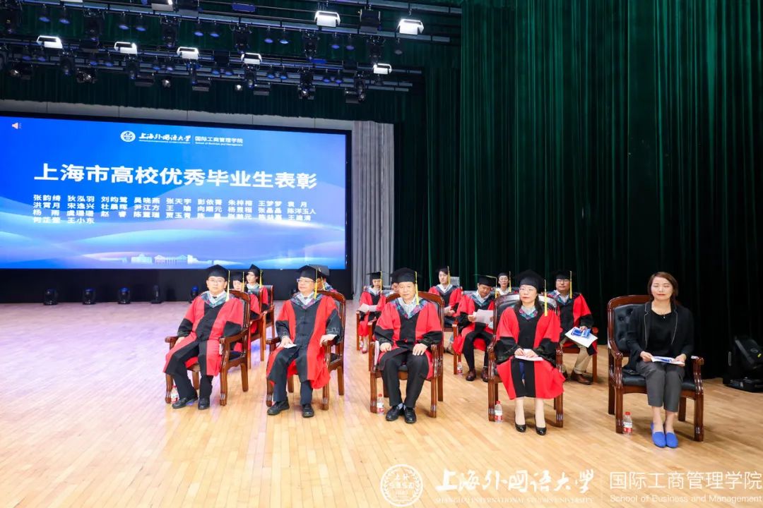 首先,在优秀毕业生表彰环节,副院长马宝君宣读表彰名单。获得上海市优秀毕业生、上海外国语大学优秀毕业生和国际工商管理学院优秀毕业生的学生们依次上台,由马宝君和杨晓兰为同学们颁发荣誉证书。他们当中有的专心科研发表了多篇SCI论文,有的在创新创业赛事中斩获100多项奖项,有的自愿投身到祖国基层一线建功立业,有的拿到名校的研究生录取通知,他们展示出了管院学子最美的奋斗姿态。