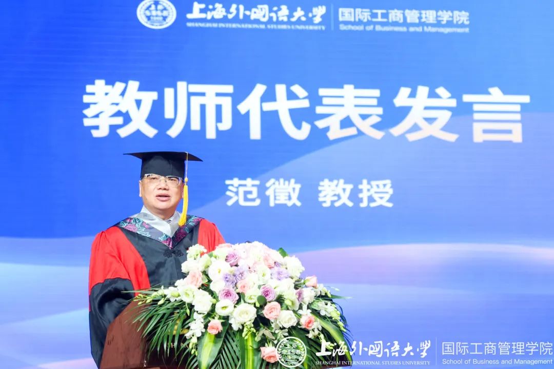 教书育人、孜孜不倦,学院首任院长范徵教授作为教师代表,为毕业生们送上祝福。他首先向同学们介绍了管理学院自建系以来38年的发展史,现在学院已建立“本硕博贯通式”培养体系并通过了多项高水平国际认证,这些成就离不开一代代管院师生们的共同努力。他希望同学们作为商学院的毕业生,在未来无国界的世界、无国界的管理中,成为既有数字化的专业知识、又具备人文化的通识知识、跨文化的语言知识,更需成为具备隐藏在这些知识背后的创新性思维和方法的专业人才。
