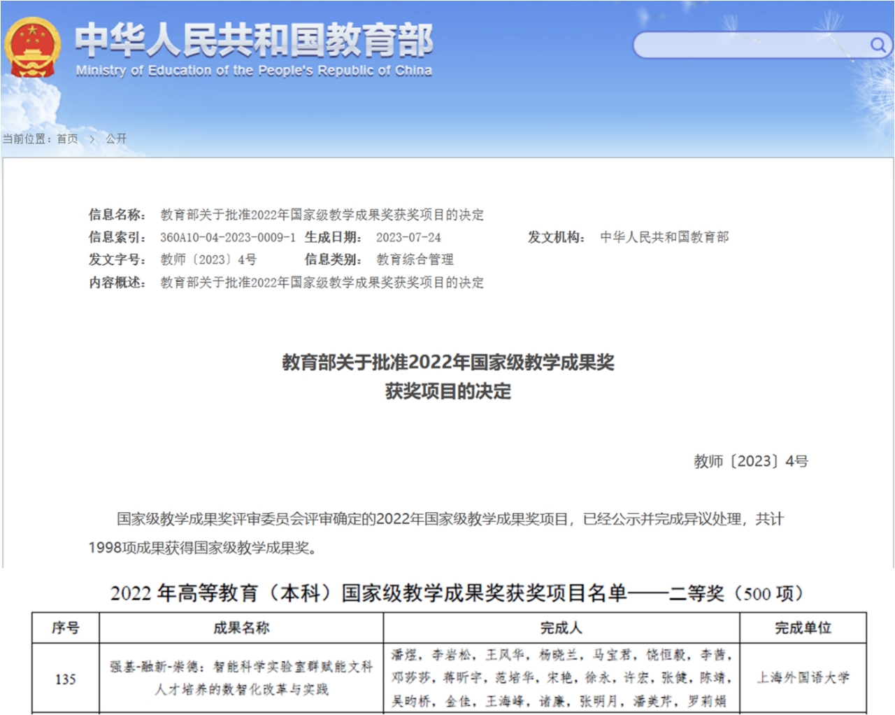 7月24日,教育部发布《教育部关于批准2022年国家级教学成果奖获奖项目的决定》(教师[2023]4号),上海外国语大学国际工商管理学院《强基-融新-崇德:智能科学实验室群赋能文科人才培养的数智化改革与实践》喜获高等教育(本科)国家级教学成果二等奖。这是学院首次牵头获得国家级教学成果奖,实现学院国家级教学成果奖历史性突破。