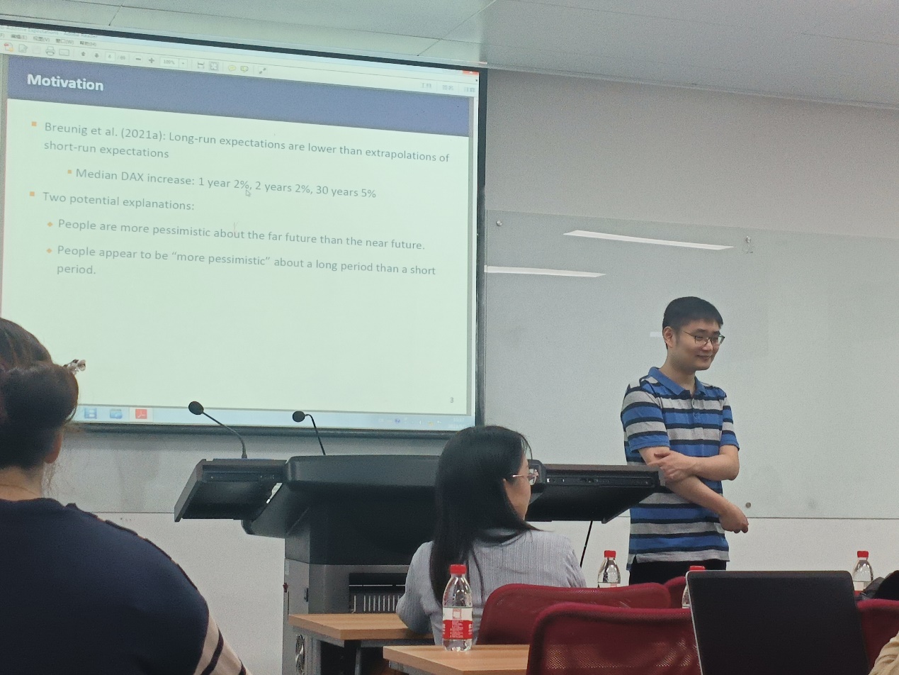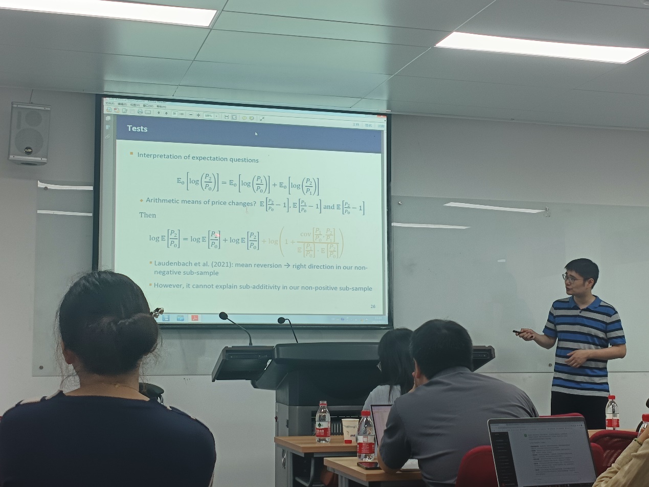 其次,在探究不同时间股市预期的相加性背景下,有以下研究问题:对价格变动的预期是否受到该期间是否被划分为子期或被视为一个整体的影响?针对该研究问题,孙老师分析了1990位受访者的采访样本,并且从加性与非加性,次可加性与超可加性两个维度进行探究,研究了不同时间股市预期的相加性。该研究检验了期望的跨期可加性,发现大多数期望是不可加的。而且使用一个压缩模型解释了其中最主要的次可加性。当被问及十年间隔时,受访者预计股票价格变化不等于,但更接近于涵盖相同十年的两个较短时间间隔内的预期总和。这种次相加性是不合理的,因为它不能源于短期外加的聚集。之后,孙老师提供了一个简单的模型,用来刻画这个期望的可加性。模型估计表明,该模式与时间感知一致,其中较短的时间间隔具有成比例的较大权重,并且发现受访者的相加性程度与进行更大的金融投资相关。