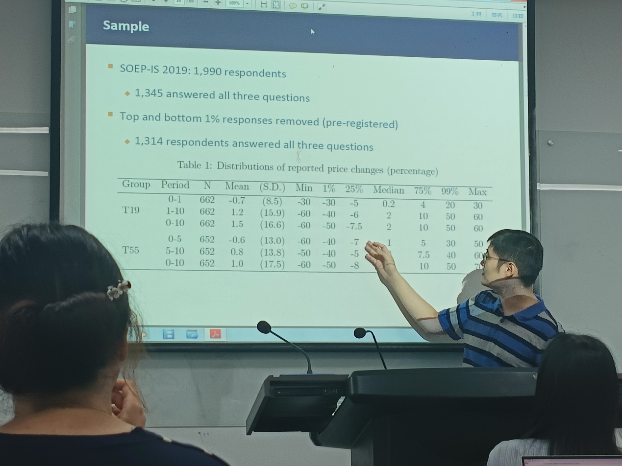 主讲嘉宾孙晨老师围绕动机、研究问题、样本、测试、与背景变量的相关性、模型和估计、结论以及未来研究等几个方面对不同间隔内主观期望的非相加性展开详细介绍与分析。首先,孙老师提出了两个可能的解释。一是人们对遥远的未来比对不久的未来更悲观。二是人们似乎对一个较长的时期比一个较短的时期“更悲观”。