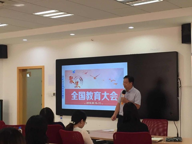 徐永书记首先强调全国教育大会是由党中央直接部署召开的高规格会议,体现了党对教育事业的高度重视。然后,他依据人民日报的系列文章,带领大家分别从5个方面学习了习近平总书记9月10日在全国教育大会上的重要讲话内容,即教育是国之大计、党之大计;要牢牢把握教育改革发展的“九个坚持”;培养德智体美劳全面发展的社会主义建设者和接班人;建设高素质专业化教师队伍;大力推进教育体制改革创新。