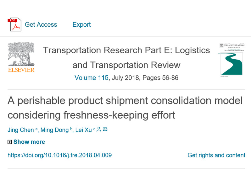 Jing Chen, Ming Dong, Lei Xu*, A perishable product shipment consolidation model considering freshness-keeping effort. Transportation Research Part E, 2018, 115(7), 56-86.