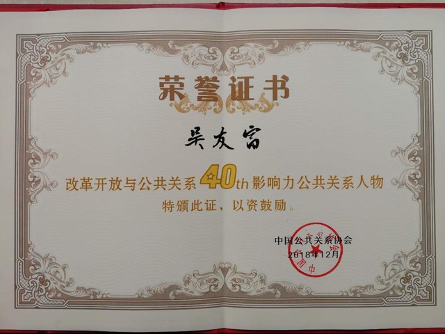 会上发布了“改革开放与公共关系40年”40位影响力公共关系人物,我校吴友富教授荣获此誉。吴教授在高校从事公共关系学教学工作30年,合作翻译出版的《公共关系与实践》著作被评为20世纪80年代中国6本公共关系“优秀出版物奖”之一,是中国最早招收公共关系方向博士生的博导,创立全国公共关系学专业院长(系主任)联席会议委员会,领衔促成公共关系学专业列入教育部普通高等学校本科专业目录,创办目前中国大陆唯一一份公共关系理论刊物《公共关系研究》集刊。我校成为全国目前唯一一所具有公共关系学本科专业、硕士专业、博士方向三个办学层次并引领全国高校公共关系学专业建设与发展的高校。