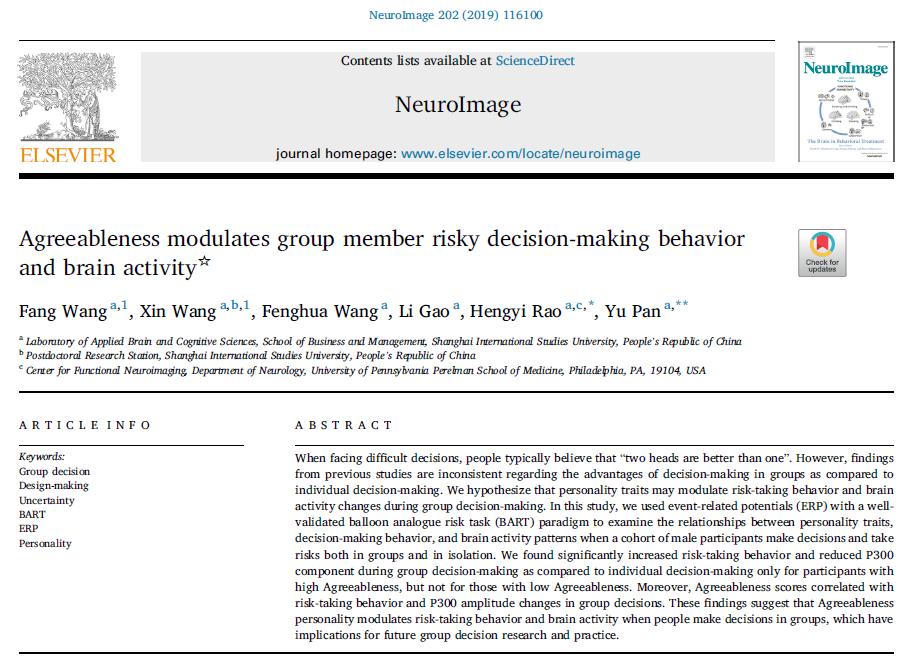 2019年8月,上海外国语大学脑与认知科学应用重点实验室与神经管理研究所团队、国际工商管理学院教师合作,以上海外国语大学为第一单位,在神经影像学一区期刊NeuroImage上发表学术论文“Agreeableness modulates group member risky decision-making behavior and brain activity”(NeuroImage, Volume 202, 2019, 116100, ISSN 1053-8119, https://doi.org/10.1016/j.neuroimage.2019.116100.)。潘煜教授和饶恒毅教授为本文共同通讯作者,王芳讲师和王欣讲师为本文共同第一作者,王风华教授和高丽副教授为本文合作作者。