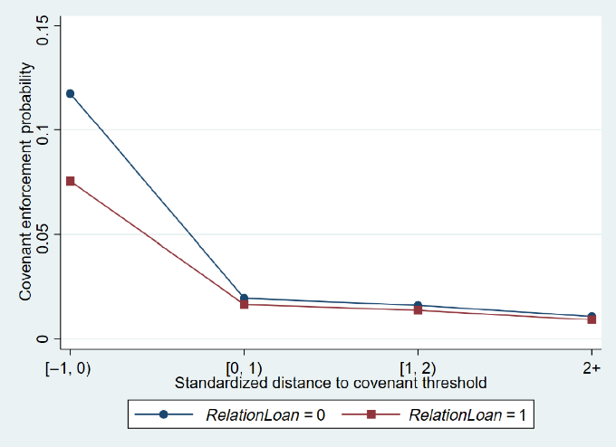然而,债务契约性条款一般是基于企业的会计信息制定的,而会计信息在很多情况下只是企 业真实经营状态和违约风险一个较为粗略的反映,银行如果机械地按照债务契约性条款来执行合同,可能会犯一类错误(Type I error),即将本来财务稳健的企业推向技术性违约境地,进而损害借款企业价值。本研究发现,由于在过往借贷关系中积攒了较多的软信息,关系型银行会更少地依赖会计信息来执行债务契约性条款。具体而言,当企业的财务指标突破债务契约性条款限制时,与企业有借贷关系的银行执行债务合同的可能性比未和企业打过交道的银行低50%,换句话说,关系型银行在执行债务合同时更有“弹性”。
