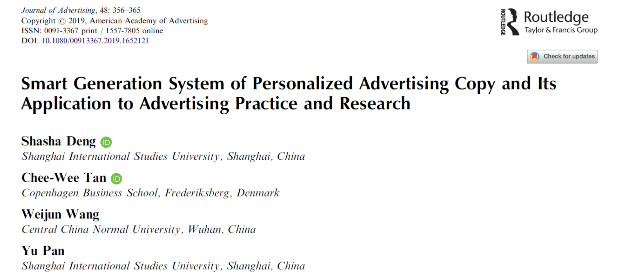 2019年9月,上海外国语大学脑国际工商管理学院教师合作,以上海外国语大学为第一单位,在广告学国际顶级期刊Journal of Advertising上发表学术论文“Smart Generation System of Personalized Advertising Copy and Its Application to Advertising Practice and Research”(Journal of Advertising 2019, Volume 48, issue 4, ISSN 0091-3367, https://doi.org/10.1080/00913367.2019.1652121.)。邓莎莎副教授为本文第一作者,潘煜教授为本文合作者。