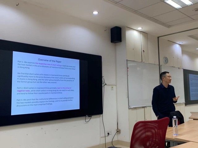 在讲座中,杨挺老师先对卖空的概念和属性进行讲解,通过以中国大陆和中国香港两大资本市场进行卖空机制的对照分析。通过采集价格发现、短期抛空、新闻信息等关键指标数据,杨老师构造了以信息共享为基础的若干项实证模型,分别检验了卖空机制在价格发现中作用、卖空者对相关新闻报道的反馈与敏感度。杨老师在研究中发现,相比H股,中国大陆的A股卖空者对市场定价机制有更显著的促进作用,而中国香港的H股卖空者往往依据中国大陆卖空者的经济行为来做决策;中国大陆的卖空者对负面的金融新闻更为敏感,反应更为迅速。通过杨老师深入浅出的介绍,我院师生在对金融市场定价机制和运行有较深刻认识的同时,也收获了相关研究和分析问题的方法。