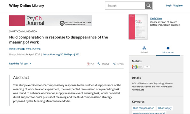 2020年4月,硕士研究生欧阳枫,在其导师孟亮副教授(消费行为与神经决策方向硕士生、博士生导师)的指导下,作为第二作者在SSCI期刊PsyCh Journal上发表学术论文Fluid compensation in response to disappearance of the meaning of work。PsyCh Journal是中国第一本心理学专业的英文期刊,由中国科学院心理研究所主办。该研究通过一项实验室实验,发现工作意义消失会诱发补偿效应。该发现为人类对意义的追寻提供了佐证,也为意义维持模型中的流动补偿策略提供了证据。